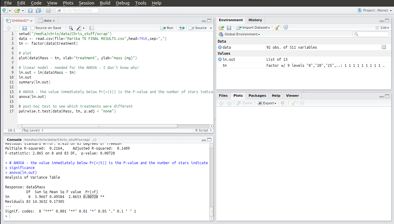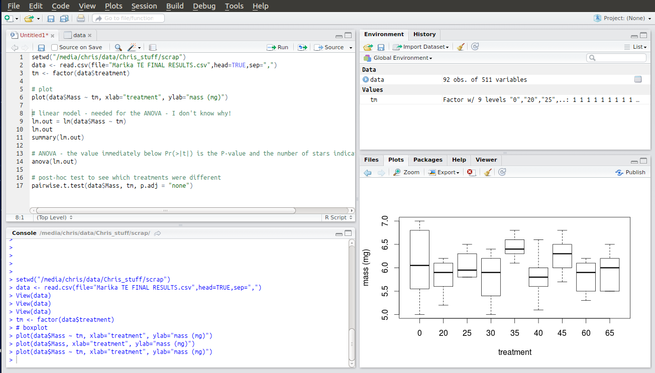 In this data set the first column contains numbers that are not data but that are a code for the various treatments in this experiment. We don’t want R to treat these numbers as numbers, but as categories. Therefore the third line of code in the script tells R to create something called a factor to use as categories to interpret your data but not to use as numerical values. When you run this line you will see another entry in the Global Environment window confirming that R has created a new factor called “tm” with the numbers as names for each treatment category.