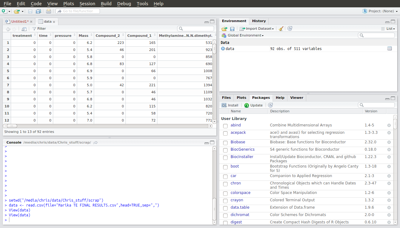 In this example each row contains data for one sample. The first four columns characterise the experimental treatments the samples have been subjected too and the mass of sample analysed. You don’t need sample names or numbers, although it doesn’t matter if they are in there. They’re just not necessary for your stats. What the rest of the columns in this data set are doesn’t matter. As it happens they are peak areas from the GC-MS but they could be cell counts or enzyme activity or whatever you’re measuring. You should arrange your data like this in Excel and save the sheet as a .csv file in a convenient folder that you can label something like “stats” or “results”.