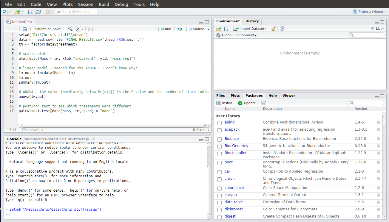R is very powerful but awful to teach students to use. My students almost universally detest it because they have to learn to code. Unfortunately they haven’t much option but to use it to get stats done! (XLSTAT anyone?) So I wanted to throw out a quick post detailing how to carry out an ANOVA in R and interpret the output the easy way. Most importantly I don’t want to get into the mechanics of R or the theory of stats. I’m far from an expert in either but this is the simplest and most common test I need to get students to perform so hopefully this will save them and me a lot of headaches in future.