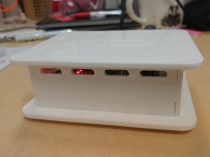 I would have taken a picture of the two boards mounted inside but the lasercut bits fitted together so snugly I didn’t want to try and separate them again in case something broke. You can see the lights of the Arduino inside through the ventilation holes 🙂