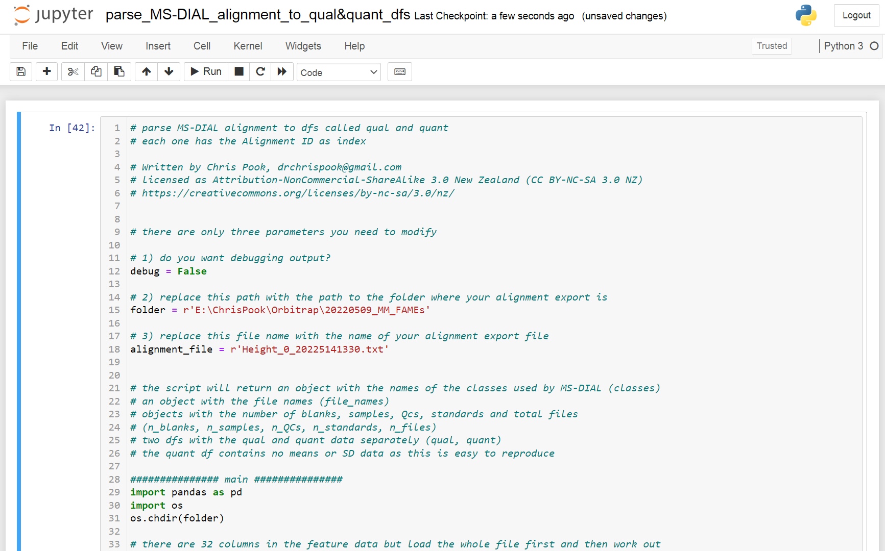 If you wish to access the data from your MS-DIAL analysis programmatically for post-processing, then you face the non-trivial challenge of parsing the output to a dataframe. This is made challenging because the format of the alignment exports is not a simple xy matrix, but contains two data frames nested within each other, one for the qualitative information and the other for the quant. Consequently the headers for the qualitative data frame begin on row 5, as can be seen in this screenshot.